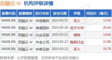 百融云-W(06608.HK)发布公告,赵宏强因他希望投放更多时间于他的其他事务而已提呈辞任公司执行董事及首席财务官,自2023年5月25日起生效。 截至2023年5月25日收盘,百融云-W(06608.HK)报收于10.0港元,上涨0.1%,换手率0.42%,成交量175.7万股,成交额1747.18万港元。投行对该股的评级以买入为主,近90天内共有2家投行给出买入评级,近90天的目标均价为16.81港元。中信建投最新一份研报给予百融云-W买入评级,目标价13.5港元。 机构评级详情见下表: 百融云-W港股市值...