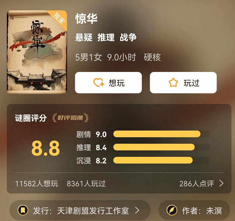 剧本杀的载体,是语言和文字,因此游戏时长能最直观的表现出一部剧本的体量宋勤华。那些需要玩家耗时十小时以上的剧本,往往有着丰富的游戏内容。 ˂img src="https://www.byxxw.com/zb_users/upload/2022-09-19/6327f04b7bbb4.jpg" alt="《惊华》:浮沉流沙 宋勤华,转瞬惊华"˃ 此类剧本,通常有着8-10人的游戏人数,或是复杂繁琐的有趣机制宋勤华。天津剧盟发行工作室2020年出品的6人本《惊华》,则凭借宏大的内容支撑起了超长的游戏时间。这部作品连私聊...