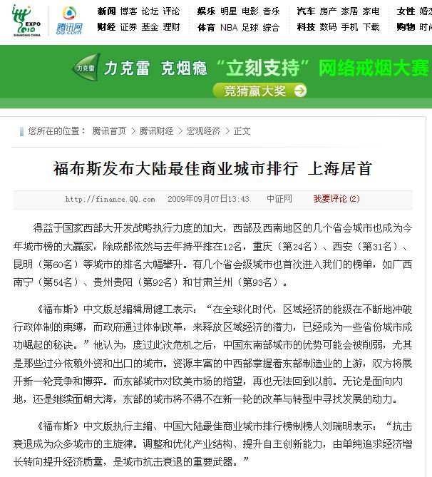 福布斯2009中国大陆最佳商业城市排行榜 上海居首