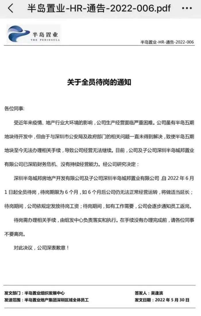 1► 深圳老牌开发商全员待岗利海集团,期限6个月 5月30日晚,贴着深圳房产开发商半岛置业标志的《关于全员待岗的通知》(以下简称《通知》)文件在网上流传利海集团。 文件内容主要为:目前公司已深陷危机、没有持续经营能力,深圳半岛城邦房地产有限公司及子公司深圳半岛置业有限公司,自2022年6月1日起全员待岗,待岗期限为6个月利海集团。 ˂img src="https://www.byxxw.com/zb_users/upload/2022-10-19/634f7d4a87d1d.jpg" alt="“全员待岗”6个月...