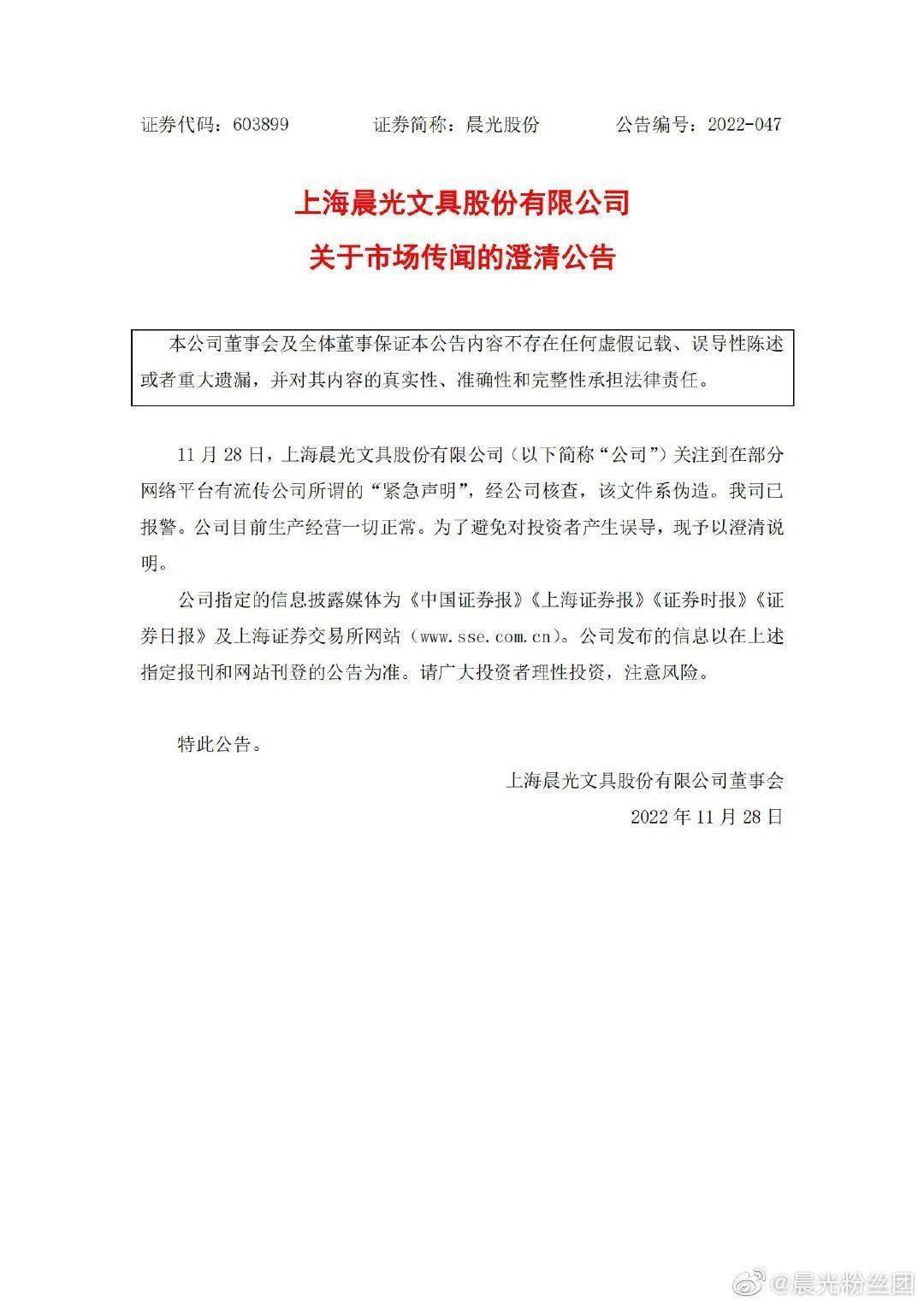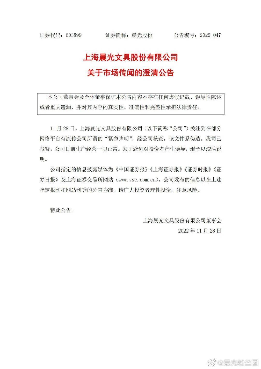 近日,网上流传一张“紧急声明”文件显示,上海晨光文具股份有限公司将于11月29日起暂停线上线下店面等渠道的A4纸销售,该消息引发关注。 今天(28日)上午, 晨光股份(603899.SH)发布公告称,该公司关注到在部分网络平台有流传公司所谓的“紧急声明”, 经公司核查,该文件系伪造。该司已报警,目前生产经营一切正常。 同日,记者咨询晨光股份证券部,工作人员告诉记者,“不存在‘紧急声明’所说的情况,目前公司生产经营一切正常”。 据晨光股份官方资料显示,上海晨光文具股份有限公司为全球最大的文具制造商之一,产品涵盖书写...