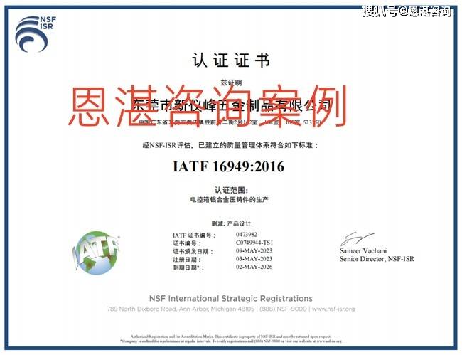 作为IATF16949质量体系认证咨询公司,我们辅导的一家东莞企业在五月通过了IATF16949质量管理体系认证,顺利获得了16949认证证书。在下文将介绍下IATF16949认证的相关内容。 IATF16949质量体系认证证书样本,恩湛咨询辅导 IATF 16949认证简介:ISO/TS 16949是国际汽车推动小组 (International Automotive Task Force ,IATF ) 根据ISO9001对汽车产业供应商所草拟的特定质量系统要求。 IATF16949前言原文:“本汽车质量管...