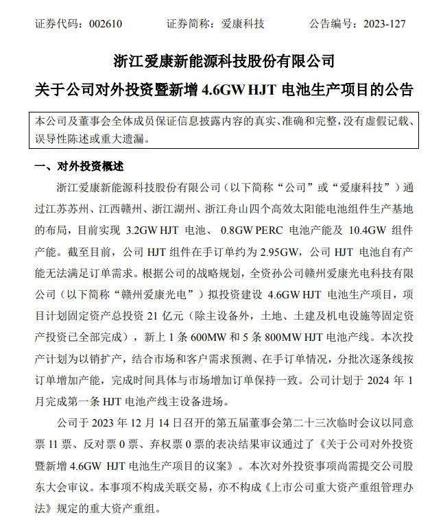 导读 爱康科技:孙公司拟投资21亿元建设4.6GWHJT电池生产项目;奥特维:控股子公司签订约2.3亿元销售合同;26.34%,协鑫钙钛矿叠层组件效率再破世界纪录;总投资70亿元!江苏琏升科技12GW异质结电池项目在南通国家高新区开工;三一重能:拟出售两家子公司股权 预计增加公司利润7.24亿元;宋海良与晶科能源董事长李仙德会谈;工信部电子信息司金磊:促进光储端信融合 支持拓展国际合作新模式;天合富家董事长高海纯:统筹规划全国屋顶分布式光伏开发布局和建设时序 让行业有规划可依…… 行业动态 01 爱康科技:孙公司拟...