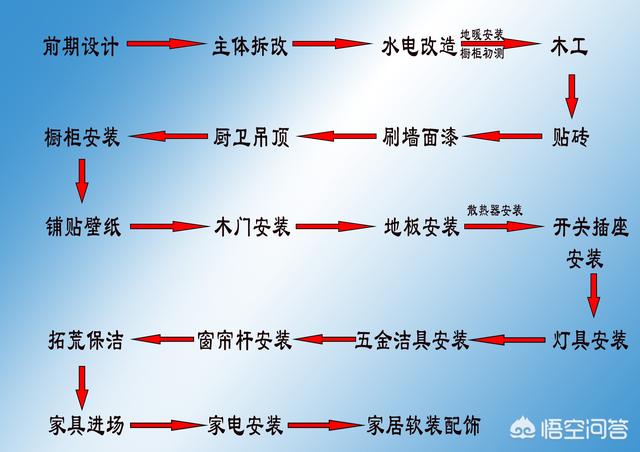 热爱生活,热爱设计,我是您的专属设计师陈行志,曾帮助6000万人解决装修问题,感谢您的支持,房屋装修对于很多业主来说是一件非常重要的装修事情。 但对于那些首先装修房屋的业主来说,他们不知道装修的施工过程。 今天为大家简单介绍一下装修施工流程,让我们一起来看看。 ◆步骤1:准备阶段 这一阶段主要是学习阶段和初步规划阶段,要大量储备装修知识,做好每个项目的大致资金计划,和家人商量推荐一个装修总指挥,确定大致装修风格装修。 装修知识储备: 网上查询:去一些专业的家装网站,我们聊天订阅号获取知识,找到更好的家装经验...