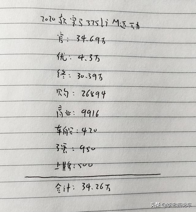 李老猫说车为你非专业解答各类选车用车问题宝马3系定位于一款中级奢华轿车产物,次要对飚奥迪a4l,奔跑c级,那款车品牌张扬,运动操控性能超卓,关于年轻小资而言长短常有吸引力的宝马3系优惠。其在2020年前四个月累计销量为3.37万台,均匀月销在8千以上,在那个细分市场上绝对支流。 价格方面,小我比力保举2020款宝马325lim运动套拆版,官方指点价34.69万,优惠幅度在4.3万摆布,末端裸车成交价30.39万摆布,全数落地再加购买税26894,车船税420...