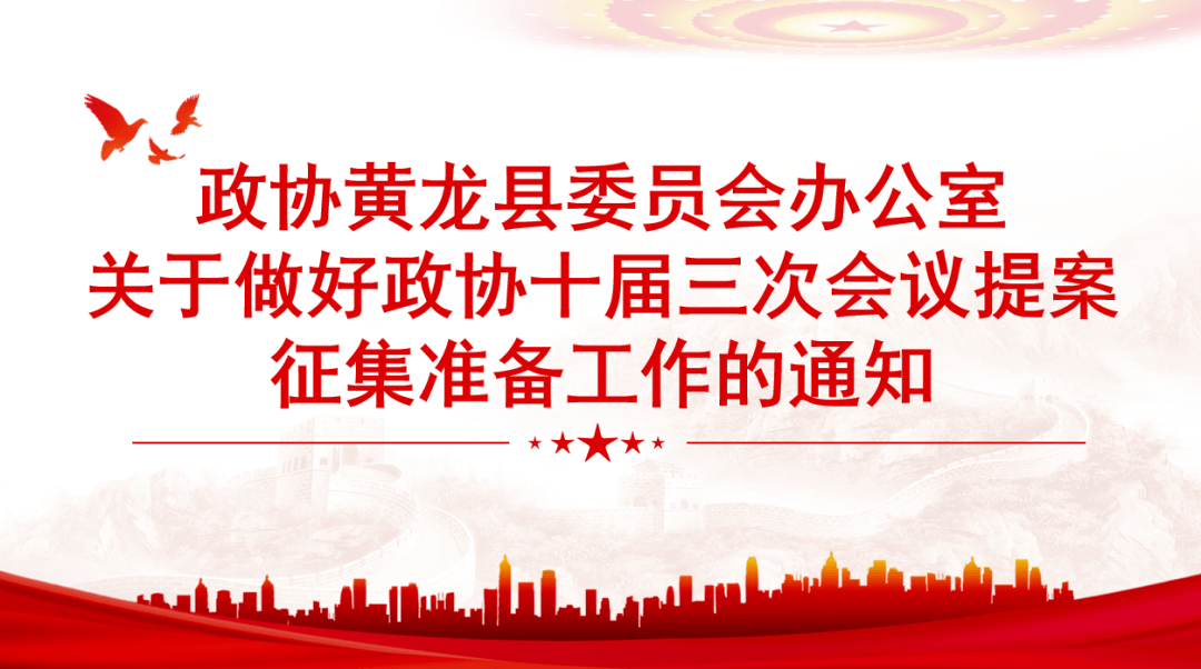 政协黄龙县委员会办公室 关于做好政协十届三次会议提案 征集准备工作的通知 县政协委员、政协各参加单位、各专门委员会: 提案是委员履行政协职能的重要方式,也是协助党委、政府实现决策民主化、科学化的重要渠道,同时也是委员参政议政能力水平的具体体现,更是委员的责任和义务。根据县政协新修订的《提案工作条例》规定,为切实提高提案整体质量,持续发挥政协提案在促进全县经济社会发展、民生建设等方面的重要作用,现就做好政协十届三次全会提案征集有关事项通知如下: 征集时间 2023年11月10日至县政协十届三次全会召开前。 征集范围...