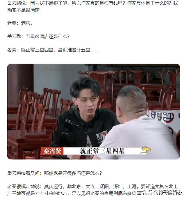 秦霄贤,本名秦凯旋,1997年生于辽宁省沈阳市,毕业于北京戏曲艺术职业学院秦凯旋。秦霄贤很小的时候,父母就离婚了,而且秦霄贤还有一个姐姐,离婚后妈妈一直带着秦霄贤和姐姐生活。后来秦霄贤和姐姐都随了妈妈的姓。而且秦霄贤也曾在舞台上说过自己是单亲家庭。 至于说老秦到底多有钱,德云逗笑社第一季中小岳岳岳云鹏曾经问过秦霄贤,秦霄贤才第一次说到身世,家里主要开酒店,三四星的多,还准备开五星秦凯旋。而且酒店主要开在了一线城市,按照这个价值估算,每间酒店大约就得大几千万甚至上亿,这样算下来,北上深再加上大连、沈阳等地,整体估值应...