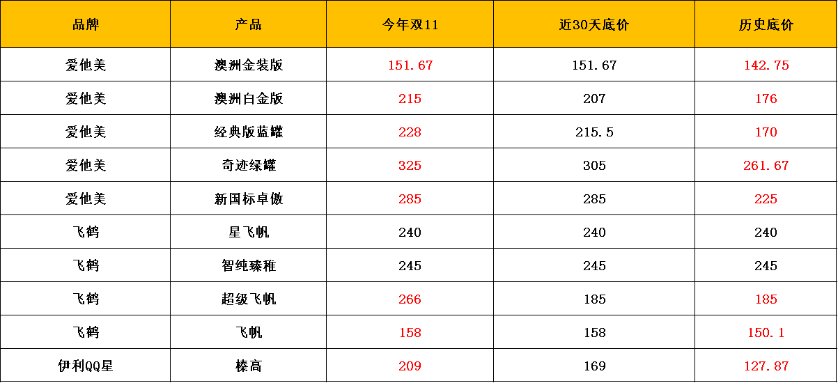 京东在喊真低价、淘宝在喊真低价,到底真低价了吗? 我们分析了爱他美、飞鹤、伊利QQ星榛高等热门品牌,来进行多维度对比分析,包括同款商品多个店铺在售价格,销量,价格等,得出了一份婴幼儿奶粉双11价格揭底报告,结果发现近6成商品没有达到历史底价,你还觉得你买的是真低价吗? 3大品牌热销TOP1产品双11价格力分析中,有近8成今年双11价格不如历史底价。 数据来源:慢慢买APP 这些商品中,包括爱他美金装,飞鹤星飞帆,伊利QQ星榛高,其中其中较历史底价最高涨81元。 数据来源:慢慢买APP 另外甚至爱他美白金版,经典...