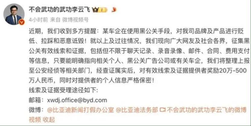 6月19日,比亚迪公开征集收集黑公关证据,奖励20万-500万元不等。 撰稿|吕嘉豪 编辑|周 展 视觉|慢 慢 无独有偶,6月20日,广汽发布杜绝网络暴力倡议书,公开征集针对广汽的网络侵权线索或证据,奖励10-100万元不等。 01 他们遭遇了什么 比亚迪被“黑公关”影响最大的事应该就是2023年11月28日,姚姓博主声称以正常驾驶方式测试比亚迪旗下方程豹汽车“豹5”的百公里油耗,得出该车型百公里油耗高达18升的结论。 除此以外,包括但不限于长期发布大量不实信息,恶意诋毁、贬低侮辱比亚迪的百万粉丝博主“龙猪-...