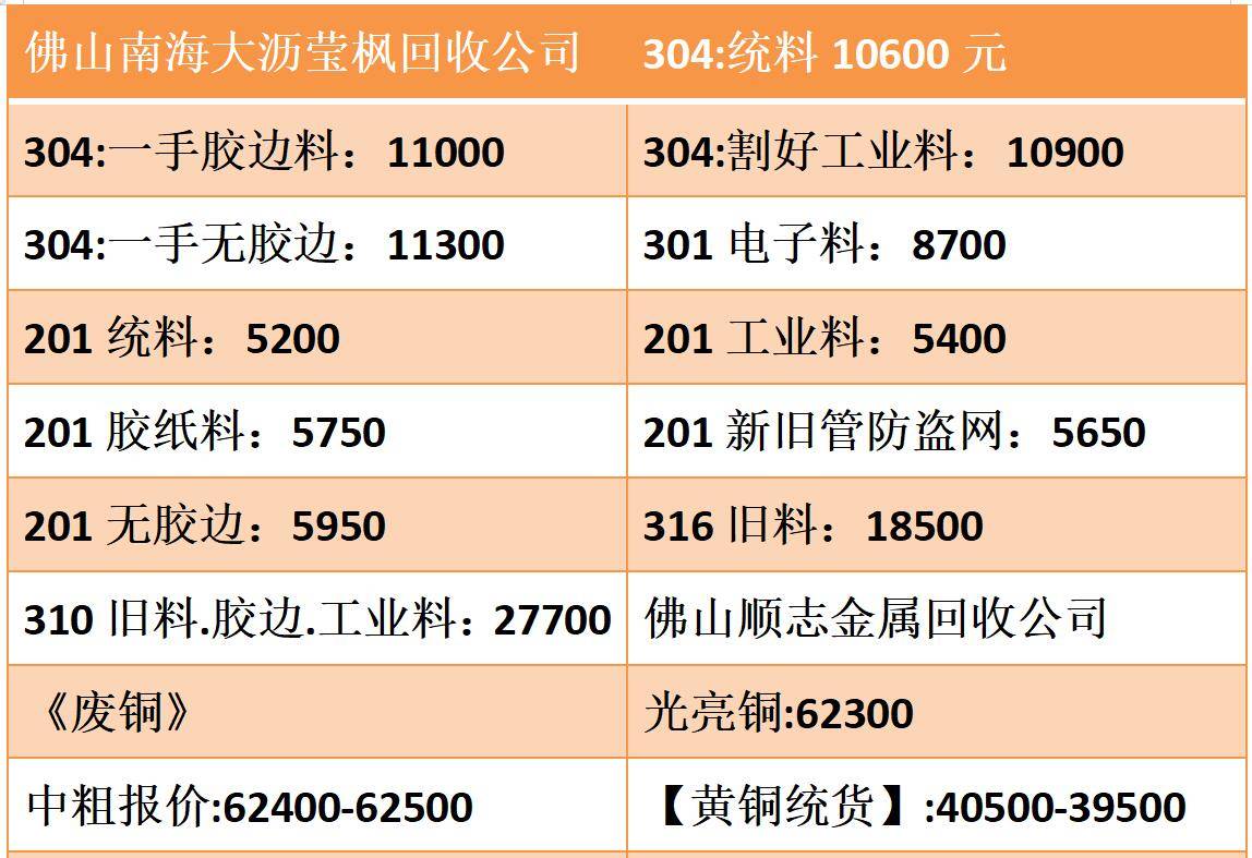 4月28日今日回收废铜光亮铜62300元一吨,废铝生铝13500-13700元一吨,201新料6000-6050元一吨,304无胶边料11450元一吨!废铝回收、废铁回收、废不锈钢回收、废纸回收、金属废料回收!(实时通金属网) 佛山废品废料回收报价4月28日 佛山南海大沥莹枫回收公司 304:统料10600元 304:一手胶边料:11000 304:割好工业料:10900 304:一手无胶边:11300 301电子料:8700 201统料:5200 201工业料:5400 201胶纸料:5750 201新旧管防盗...