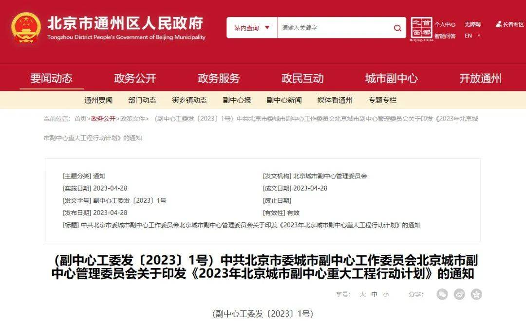 北青社区报(微信号:tongzhoushequbao)记者了解到,日前,《2023年北京城市副中心重大工程行动计划》发布。 2023年,计划集中推动217项城市副中心重大工程,总投资约5065亿元,当年计划完成投资约587亿元。计划新开工78项,续建139项, 力争当年完工61项。工程涉及 基础设施领域、民生改善领域、产业领域和行政办公领域。 01 【 基础设施领域 】 基础设施领域涉及82项,本年度计划完成投资176亿元。计划新开工40项,续建42项,力争当年完工19项。 主要任务 持续推进区域互联互通,加快...