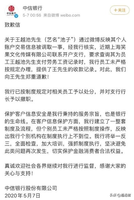 熟悉的配方上海笑果文化传媒有限公司,熟悉的味道!可惜中信银行的解释仍是不敷完美,若是再加上一个”临时工“,那就没有遗憾了!perfect! 工作的颠末各人都晓得了上海笑果文化传媒有限公司,中信银行的致歉信里也有表述,我就不再多说,在此说几点小我观点: 1、中信的致歉实锤了池子的举报,申明确有其事,中信银行固然回应比力及时,但仍是有点避重就轻地意思,那个工作不是交出1-2个替功羊就能够算了地工作,关键是银行若何庇护好客户“小我账户交易明细”隐私,不是给池子一小我...