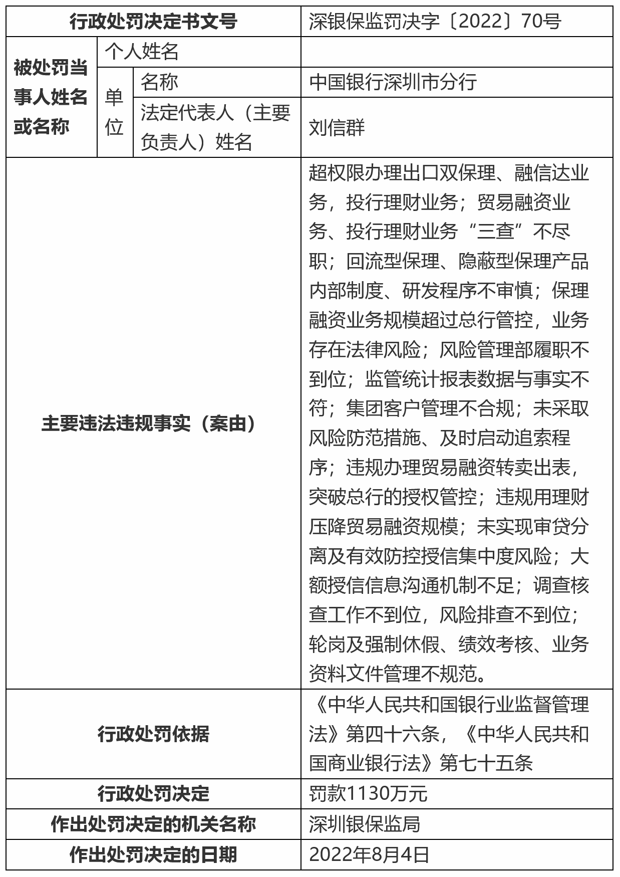 央广网北京8月8日消息 据银保监会网站消息,深圳银保监局近日对中国银行深圳市分行开出罚单,针对该分行“未实现审贷分离及有效防控授信集中度风险”等多项违法违规行为,对该分行罚款1130万元,对丁洁等4人终身禁业,对曾钰恒警告并取消高管任职资格三年,对王少俊等4人警告并罚款,对蔡春彦等3人进行警告中行深圳分行。 (截图自银保监会网站) 行政处罚信息公开表显示,中国银行深圳市分行存在以下违法违规事实:超权限办理出口双保理、融信达业务,投行理财业务;贸易融资业务、投行理财业务“三查”不尽职;回流型保理、隐蔽型保理产品内部...