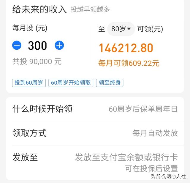 购买商业养老保险,一定要仔细对比性价比国华人寿保险股份有限公司。 距离领取养老金时间还有25年,每周定投300元,到达60岁开始每月可以领取609.22元国华人寿保险股份有限公司。其实如果我们不经过计算,感觉未来收益是自己投入的一倍多,而且可以供养到去世,还是非常划算的。 特别是商业养老保险和职工基本养老保险不一样,万一参保人去世商业养老保险可以返还“保单现金价值”或者“已经缴纳保费”两者中的最大者,也就是贯彻不吃亏的原则国华人寿保险股份有限公司。如果我们寿命比较长寿,可以永远地领取这份养老金。 ˂img src=...