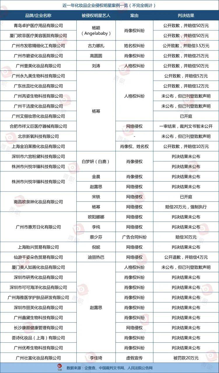 “该收手了” 近日,先是明星杨颖(Angelababy)起诉某医疗公司侵权登上热搜,后是四家化妆品公司齐齐刊登对明星杨幂的道歉声明,明星被代言、被美妆企业碰瓷的乱象再次引发讨论。 青眼进一步调查发现,近一年至少有29家化妆品相关企业被明星起诉,从已公开判决来看,基本上明星一告一个准。碰瓷明星这桩灰色生意,该停停了。 明星扎堆维权,29家企业被告 近日,两起明星侵权案件又让“碰瓷”明星这桩灰色生意走进大众视野。青眼调查发现,目前,大部分明星和企业的纠纷都集中在肖像权、姓名权等纠纷上,也有部分案件起诉案由为人格权纠纷,...