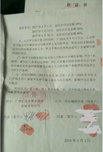 我们是2015年~2016年期间向广西汇百业置业投资有限公司(以下简称汇百业公司)购置“同乐城-华南生鲜农贸市场”的商铺或摊位业主,农贸市场位于南宁市江南区仁和路,买卖合同的公司法人有莫崇伟、农植萍等百业信息网。合同约定市场交付利用的日期是2016年10月1日,但汇百业公司不知何原因无法如期完成施工工期及交付利用,以至于2016年8月份起头市场施工处于停工形态(备注:颠末业主屡次维权活动之后才于2017年2月份有几小我在懒散施工),且未做任何通知和申明就摆设撤离了其公司相关工做人员,并撤走售楼部,封闭所有与业主的沟通的渠道,在工地停工、汇百业公司沟通无门、眼看多年积累的血汗钱可能付之东流血本无归的情况下,业主们无法寻求南宁市江南区沙井街道办调整维权,要求汇百业公司退款及付出违约金,同时请南宁电视台做了跟踪报导;末于在沙井街道办的帮忙下,2016年9月2日摆设业主代表、汇百业公司农植萍等在沙井街道办协商同意,签定了退款协议书(见照片),两边自愿协议自2017年4月1日起头根据差别类别分期退还业主款项,但在付款期限过去一个月了汇百业公司仍是没有履行协议书约定,同样没有任何申明,期间汇百业公司将市场办理权移交其他公司接手办理,工做人员屡次德律风催促业主改签新公司合同(备注:汇百业公司未做移交申明,未出头具名签约现场),还要求业主注销是退款仍是要继续保留运营权,工做人员立场恶劣,不做任何申明,以致于到如今为行汇百业公司及新办理公司始末都没有明白申明为何要改签合同?市场何时能够交付利用?若何付出违约金?为何不退款等等问题。2017年4月越来越多的业主无法忍耐一而再再而三的棍骗,再次寻求沙井街道办出头具名处置,未果;2017年4月28日业主到南宁江南区信访办上访,未果;2017年5月初汇百业公司逐个德律风告知业主可退10%~20%的款项(备注:剩余款项没有任何退款时间方案和申明),当业主赴约后被告知先签退款要求,供给账户信息,汇款时间待通知,但过去10天之后到5月13日仍未收到任何退款,如今汇百业公司已经封闭与业主对话/沟通的渠道,避谈任何退款事宜。