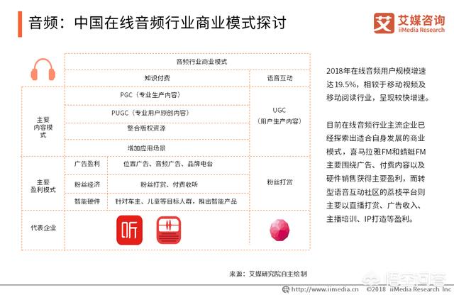 2018年在线音频用户规模增速达19.5%,相较于挪动视频及挪动阅读行业,呈现较快增速中国创意财产联盟。目前在线音频行业支流企业已经摸索出合适本身开展的贸易形式,喜马拉雅FM和蜻蜓FM次要围绕告白、付费内容以及硬件销售获得次要盈利,而转型语音互动社区的荔枝平台则次要以曲播打赏、告白收入、主播培训、IP打造等盈利。