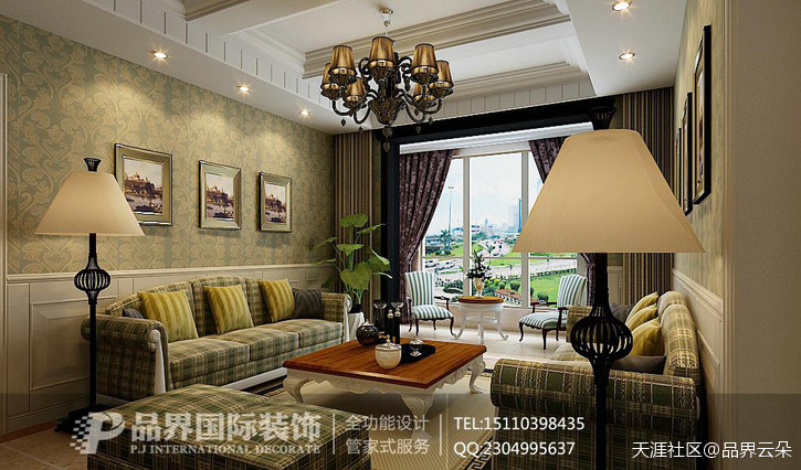 【圣湖不雅澜国际拆修】156平米美式气概客厅效果图研发——太原品界粉饰