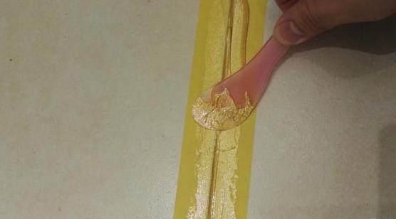 4、挤美缝剂,那个环节是比力重要的,美缝剂的颜色是按照瓷砖及总体拆修气概去选择的zhuangxiu。那个金色的很上层次。切忌不要挤太多,美缝剂没干的话不克不及乱走,要一段一段的做。