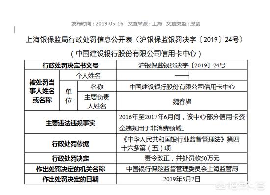 2019年5月16日,上海银保监局行政惩罚公开信息显示,农业银行、建立银行信誉卡中心因“部门信誉卡资金违规用于非消费范畴”,别离罚款50万元建行信誉卡中心。而此前两天(5月14日),汇丰银行(中国)也因同样的原因,两项合并刚被惩罚款100万元。