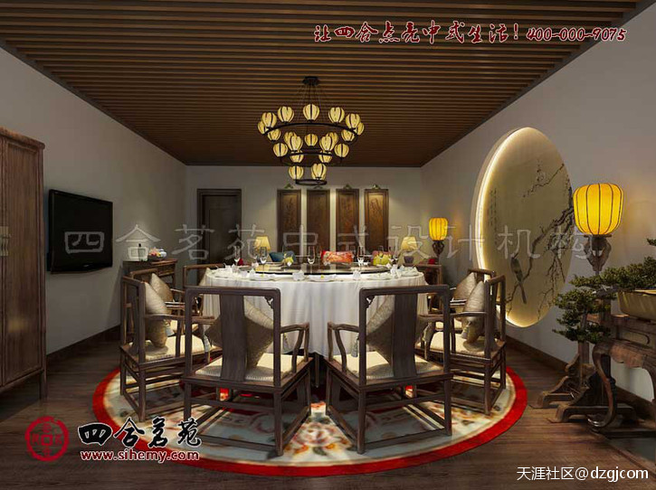 茶艺展现、茶具品鉴去,静谧的空间让人心里得以陈静的冥想,佛龛法相庄严的佛像,不雅照禅茶一味的艺术气氛营造,而吊灯的宫灯的现代笼统线条,与几何图形则构成拉伸,让空间有一种被伸展的觉得中式拆修效果图。