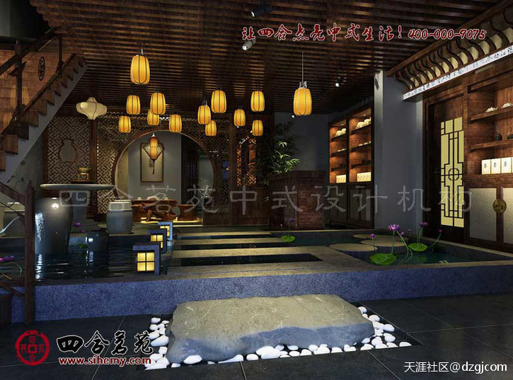 汀步与水景的运用,加强了茶室空间兴趣性、与茶客充实互动性中式拆修效果图。在此案中精细体验是相对的,较之于晶莹剔透的木做与瓷器,相较之下,石材的粗拙纹路,则更显出富有古朴的量感,同时也具有防滑地感化。