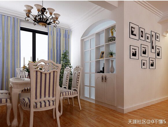 那间餐厅的占空中积较小,接纳不吊顶的石膏线粉饰,能够充实操纵空间的面积,让就餐的时候不会感应太压制,白色的石膏线和蓝黄条形纹状的窗帘相搭配,让整个餐厅具有田园色彩家拆效果图网站。