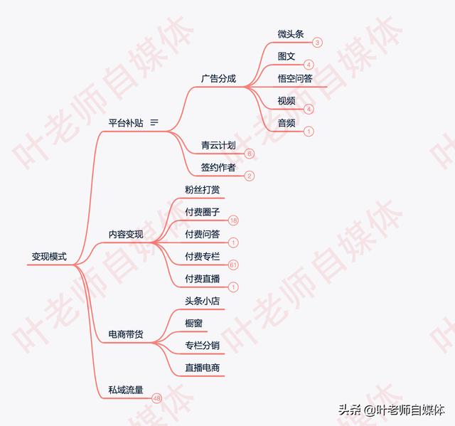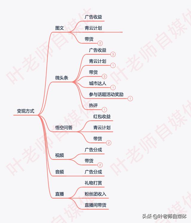 大白头条平台的变现体例之后瓶子科技,还需要再领会一下头条平台的6种体裁(文章、微头条、悟空问答、视频(包罗曲播)、音频),对应有哪些变现体例,见下图: