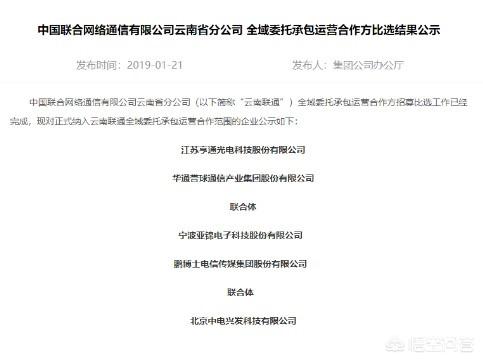 2018年12月26日,中国联通发布了云南省分公司全域委托承包运营参与比选企业公示鹏博士电信传媒集团股份有限公司。据通知布告,那三家企业别离是江苏利市光电科技股份有限公司华通誉球通信财产集团股份有限公司结合体、北京中电兴发科技股份有限公司、宁波亚锦科技股份有限公司鹏博士电信传媒集团股份有限公司结合体。那三家企业是从从三十多家企业(含结合体)中挑选而出,合作之剧烈。