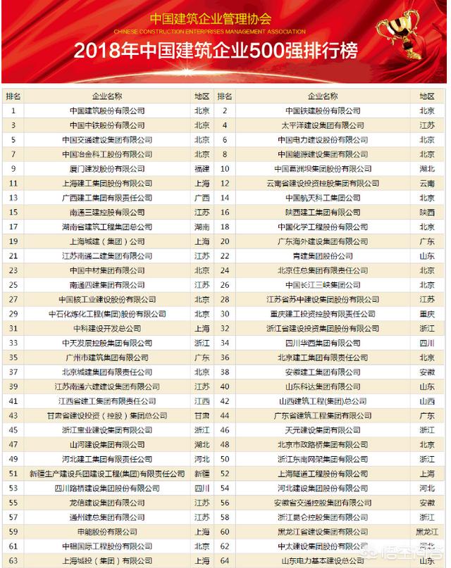 在我国对于建筑行业,有一个相对较为权威的数据排名叫做:“中国建筑企业500强”,这个榜单的数据是由中国建筑企业协会与《经济瞭望周刊》及相关研究机构、媒体等共同主办发布的,排名的依据是:综合其营业收入、资产总额、利润总额、资信等级、社会贡献、业主满意度等指标对候选企业进行排名中国冶金科工股份有限公司。