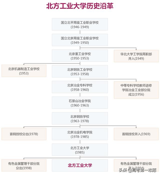 北方工业大学与同在北京的北京工业大学相比,虽然校名只有一字之差,但是两校的水平差距却极大中国北方工业(集团)总公司。这里引入北京工业大学没有矮化北方工业大学的意思,只是希望大家对北方工业大学有一个更容易理解的定位。北京工业大学是北京市属的211工程大学和一流学科建设高校,但是北方工业大学只是一所双非学校。下图是北方工业大学发展的历史沿革。