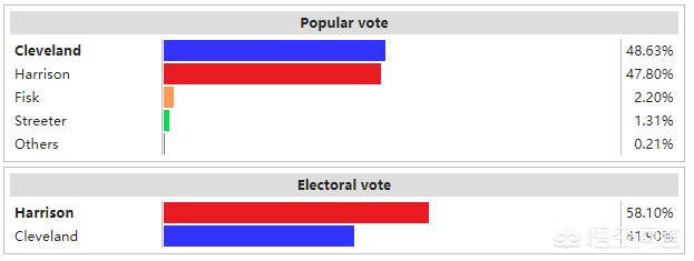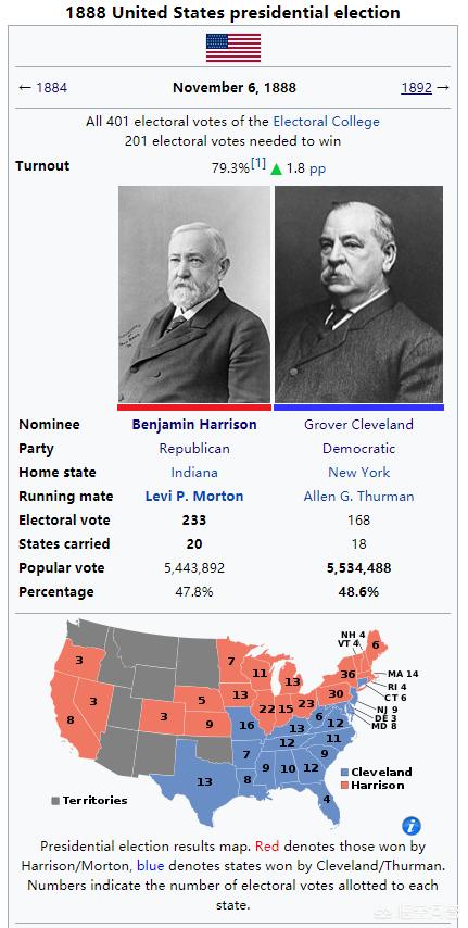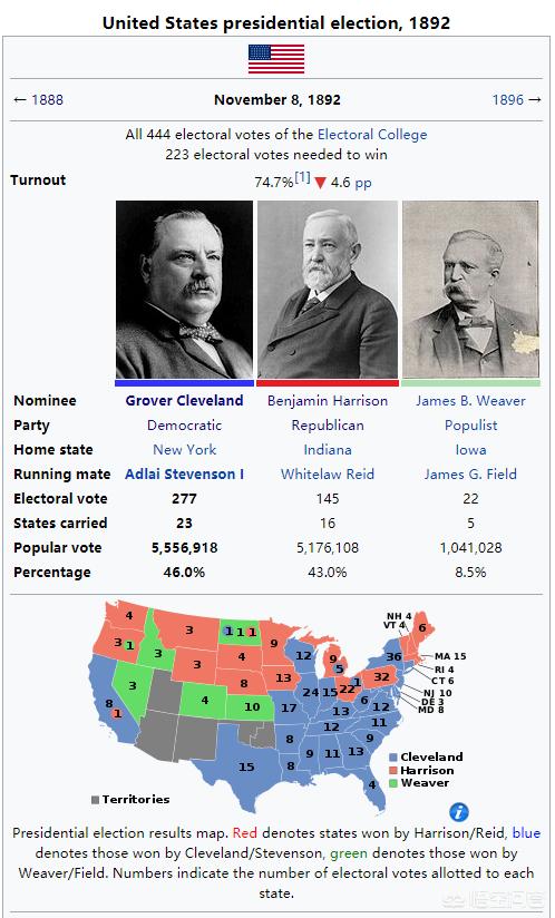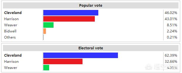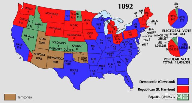 1888年美国总统大选结果在1892年总统大选中,克利夫兰再次作为民主党候选人与时任总统的哈里森对垒德法利。由于哈里森的夫人在选举前去世,哈里森根本没有参加总统竞选,包括克利夫兰在内的其他候选人也因此停止了竞选活动,使得这次选举成为了内战后最安静、最干净的一次选举。最终,这次选举克利夫兰以46%的普选票得票率与277张选举人票获得胜利,再次成为美国总统。