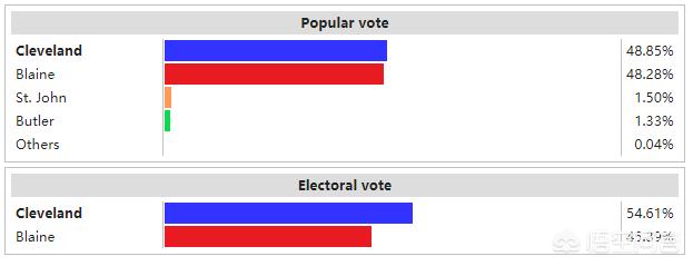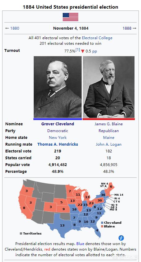 1884年美国总统大选结果1884年,克利夫兰参加了美国总统大选,并在大选中,获得了关键摇摆州的选票,从而以219张选举人票的结果击败了共和党的候选人布莱恩(James Gillespie Blaine, 获得了182张选举人票)德法利。在其第一届总统任期(1885年到1889年),克利夫兰对联邦政府进行了改革,在其任内《官员任职法》于1887年被废除。由于共和党在国会参议院占多数,所以克利夫兰不得不面对共和党控制的国会参议院,并经常使用否决权,他使用否决权的次数远超任何一位总统。比较著名的否决权是德克萨斯州种子法案。克利夫兰面对的重要问题包括白银问题和关税问题,但在其第一届任期内,由于与共和党控制的国会参议院的争斗,这些问题都没有得到解决。