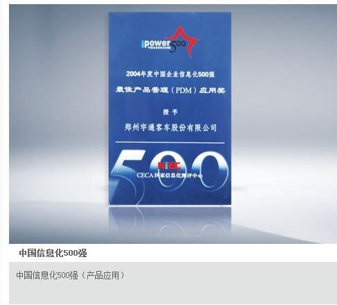 2004年河南中烟工业公司,公司作为国内客车业的标杆,率先被国家评为“中国名牌”,2005年再次率先被国家评为“中国驰名商标”;2006年,公司被商务部、国家发改委授予“国家汽车整车出口基地企业”称号,公司成为客车行业首家获得“进出口商品免验证书”的企业;2008年7月,公司被科技部、国务院国资委和中华全国总工会联合授予首批国家 “创新型企业”称号;2010年12月,在由国家工商总局、国家质检总局、中央电视台等共同主办的“2010中国年度品牌发布”活动中,宇通客车成为客车行业唯一入选“2010中国年度品牌”的企业,荣获“中国骄傲”荣誉称号