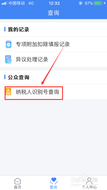 进入到【查询】页面后,接着再点击【纳税人识别号查询】这个按键纳税人识别码。