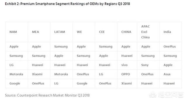 在全球绝大多数地区中,高端机份额前两位的都是苹果或者三星,不过中印两个市场除外,中国市场上是苹果第一,华为第二,前五都没三星的份儿,而印度市场上是一加第一,三星第二,苹果只排到第三,另外意外的倒是华硕手机,竟然也排到了印度高端机市场的第四,比第五位的华为还高苹果电子产品商贸。