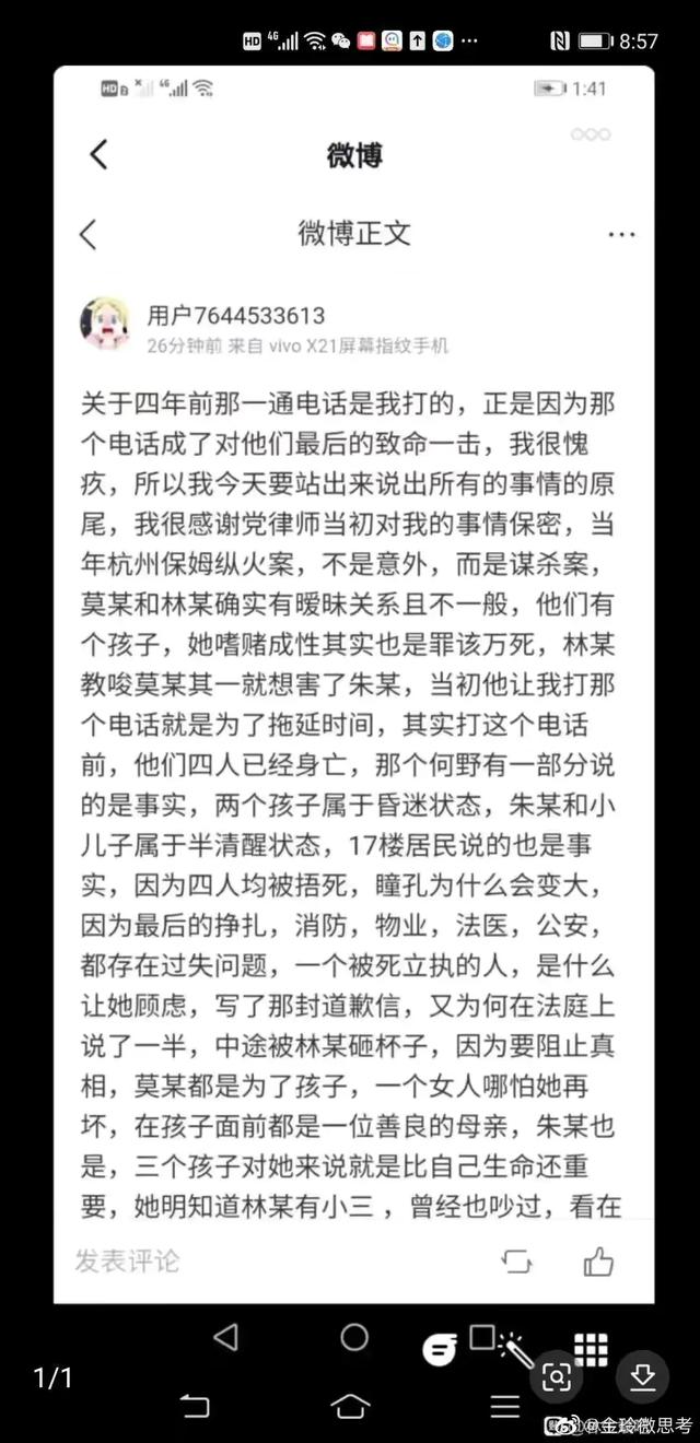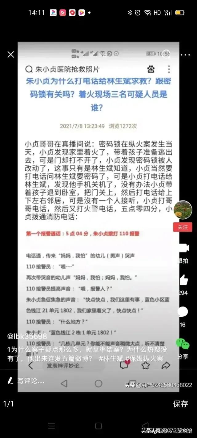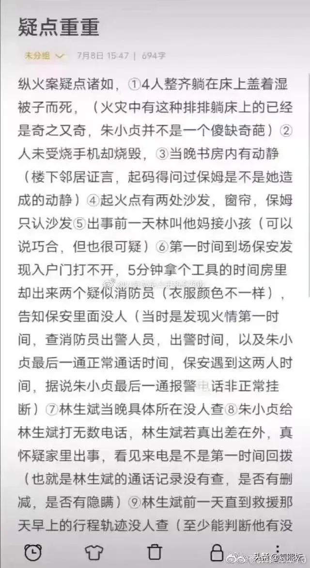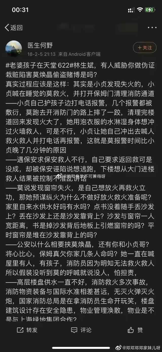 可是纵火案留下很多疑点让人无法释解王庆莲,保姆莫焕晶跟女主人相处很好,她逢人便夸她女主人非常好,还舍得借十一万四千元给她,她没有理由杀人放火,保姆莫焕晶在法庭上供认她与男主人林生斌有男女关系,并且说林生斌外面有三,他在外包养三,保姆说此话时被林生斌砸两次拿起保温杯砸她,其目的就是想阻止保姆说下去,保姆莫焕晶判死刑伏法后,林生斌竟然能违反常理送保姆儿子出国留学,有网友曝料,保姆和林生斌是情人关系,保姆的儿子是林生斌的,那么说保姆纵火是情杀?她一个女人能搞出这么计划周密的纵火案?纵火案发生后,消防人员从小贞家报警中发现了问题,报警器被人为破坏,线路被人改动,纵火案发生时,是谁冒充物业打电话给12O说人已经出来了,以至于12O没有及时赶到救人?难过查一个人电话有那么难吗?