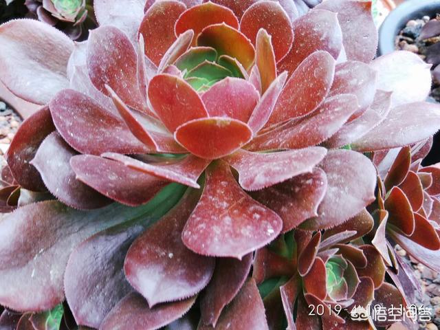 韶羞,也是景天科莲花掌属的多肉植物,而且跟紫羊绒的姊妹品种,父本和母本同为香炉盘与墨法师,法师系多肉植物之一凌娅。其叶片长匙形,相对较宽,前端钝圆,具有短尖,叶面不光滑,有种磨砂的感,叶缘也有睫毛状纤毛,叶色和形态非常多变,从绿色到明黄色到酒红色再到紫红色,随着季节不同和土壤配置不一样,堪称千变万化,固有百变韶羞之称,是非常值得拥有的法师品种。