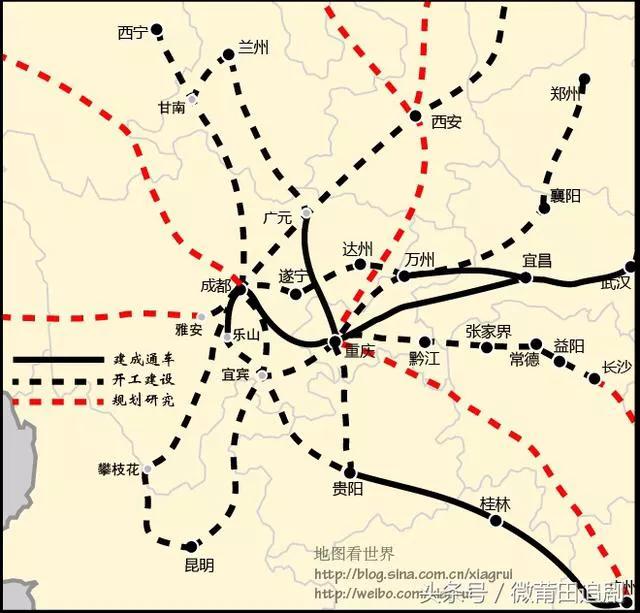 普铁时代的几大干线表现为“五纵三横”,重庆没有直接接入任何一条干线京通物流。进入“八纵八横”时代后,重庆一跃成为沿江通道、厦渝通道、包海通道三个干线的交汇。除了已经通车的有成渝城际铁路、即将通车的渝万城际铁路和已经开工的郑万高铁,“十三五”还规划建设渝长高铁、渝汉高铁(沿江通道重庆至武汉段)、渝昆高铁、渝西高铁(包海通道西安至重庆段)、达开万城际铁路。至此,重庆往北到西安,往西到成都,往西北到兰州,往南到贵阳,往西南到昆明,往东南都长沙,往东都武汉,往东北到郑州,都将有高铁,从而形成米字型铁路。在西部地区,重庆的枢纽地位可与成都相提并论了,甚至有过之而无不及。