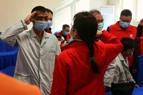 △退伍老兵复明后激动地向医务人员庄严敬礼