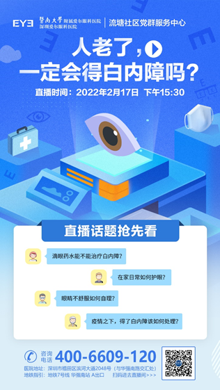 白内障常见的人群主要还是老年人,我们称之为老年性白内障。但是不是人老了,就一定会得白内障呢?白内障是老年人的“专利”吗?滴眼药水能治好白内障呢?关于白内障,你最想了解什么呢?2月17日,欢迎来到深圳爱尔眼科医院直播间,听听专业医生怎么说!