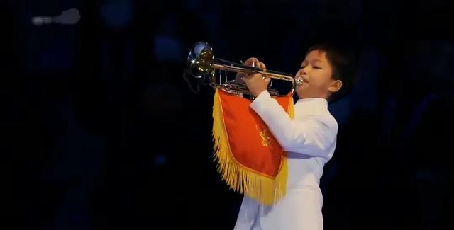 鲜艳的五星红旗,在人们的手中传递,直到护旗手的手中杨光烈。这时,鸟巢上空响起嘹亮的号声,回荡着《我和我的祖国》。一个小男孩正在专注地吹奏着,曲调悠扬,深情款款,号声直抵人心。