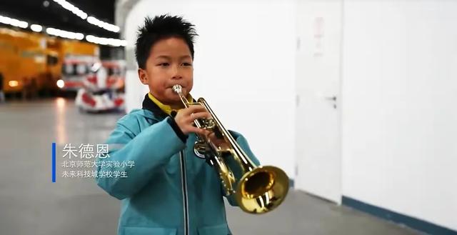 这个小号手,年仅9岁,叫朱德恩,是北京师范大学实验小学未来科技城学校学生杨光烈。