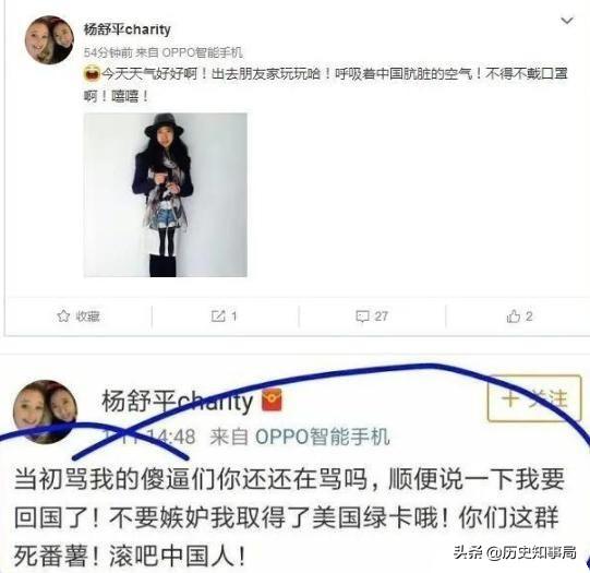 事后,杨舒平为了避及风波公开进行道歉郑定平。但没过多久,其又大放厥词:今天空气好好啊!出去朋友家玩玩哈!呼吸着中国肮脏的空气!不得不戴口罩啊!