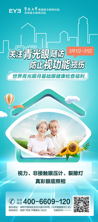 2022年3月6日至12日是第15个“世界青光眼周”,其主题是“重视青光眼随访,防止视功能损伤”。为了帮助市民朋友更好的认识青光眼,及时排查青光眼,深圳爱尔眼科医院为大家送上了一份“青光眼月”眼健康检查套餐。即日起至2022年3月31日,预约即可享受视力、非接触眼压计、裂隙灯、真彩眼底照相等检查。