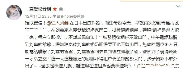 退一步说,就算刘鑫在这个事件当中有严重的过错,刘鑫爷爷、奶奶,包括住了刘忻家的房子的那些租客,没有错吗,不要伤害到他们头上周鑫。