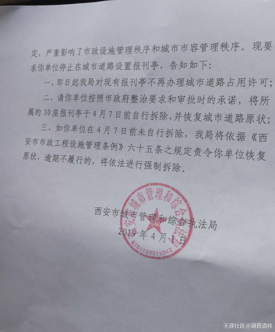 隔两日,一直等待占道证暂缓办理结束的275家已审批报刊亭,便接到了“终结令”北京市工商局企业信息查询。4月1日,三家公司均收到了来自西安城市管理和综合执法局的“最后通牒”,给他们的选项是:4月7日前自拆或之后被强拆。4月9日,各家报刊亭又收到了来自属地城管局的通知,限其4月20日前自行拆除,否则将遭强拆并处罚。