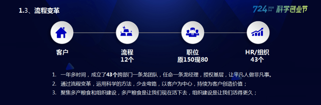 从去年6月2日导入流程型组织到今天,已经一年多,我们重新梳理了12条骨干流程,成立了43个跨部门一条龙团队袁地保。职位从原来的150变成现在的80。