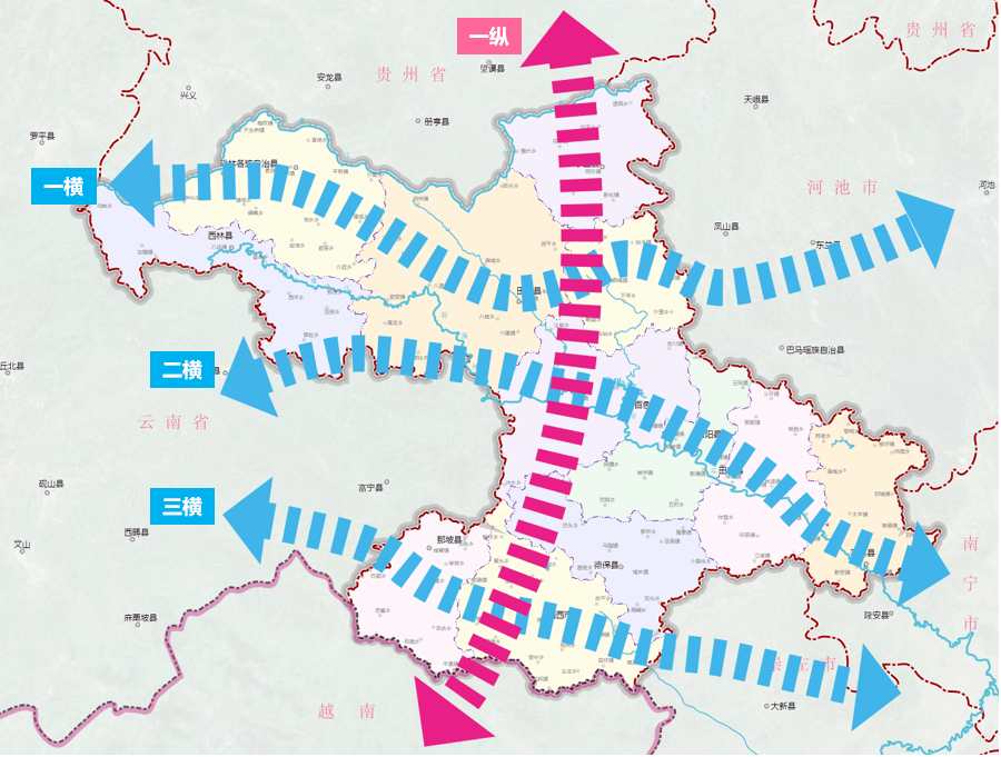 二横:南宁经百色至文山(广昆)综合交通走廊右江矿务局。起于南宁市,经平果、田东、田阳、右江区至云南(文山),向西至瑞丽口岸,向东可至广州衔接珠三角区域。