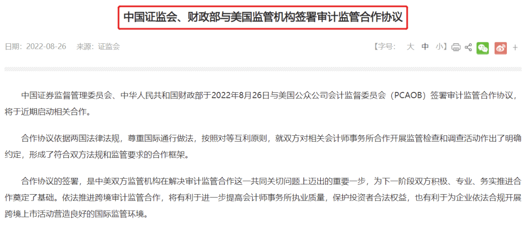 不过,2022 年 8 月 26 日晚 8 点左右,中国证监会官方宣布了中方与美方签署审计合作协议的消息中国互联网新闻中心。